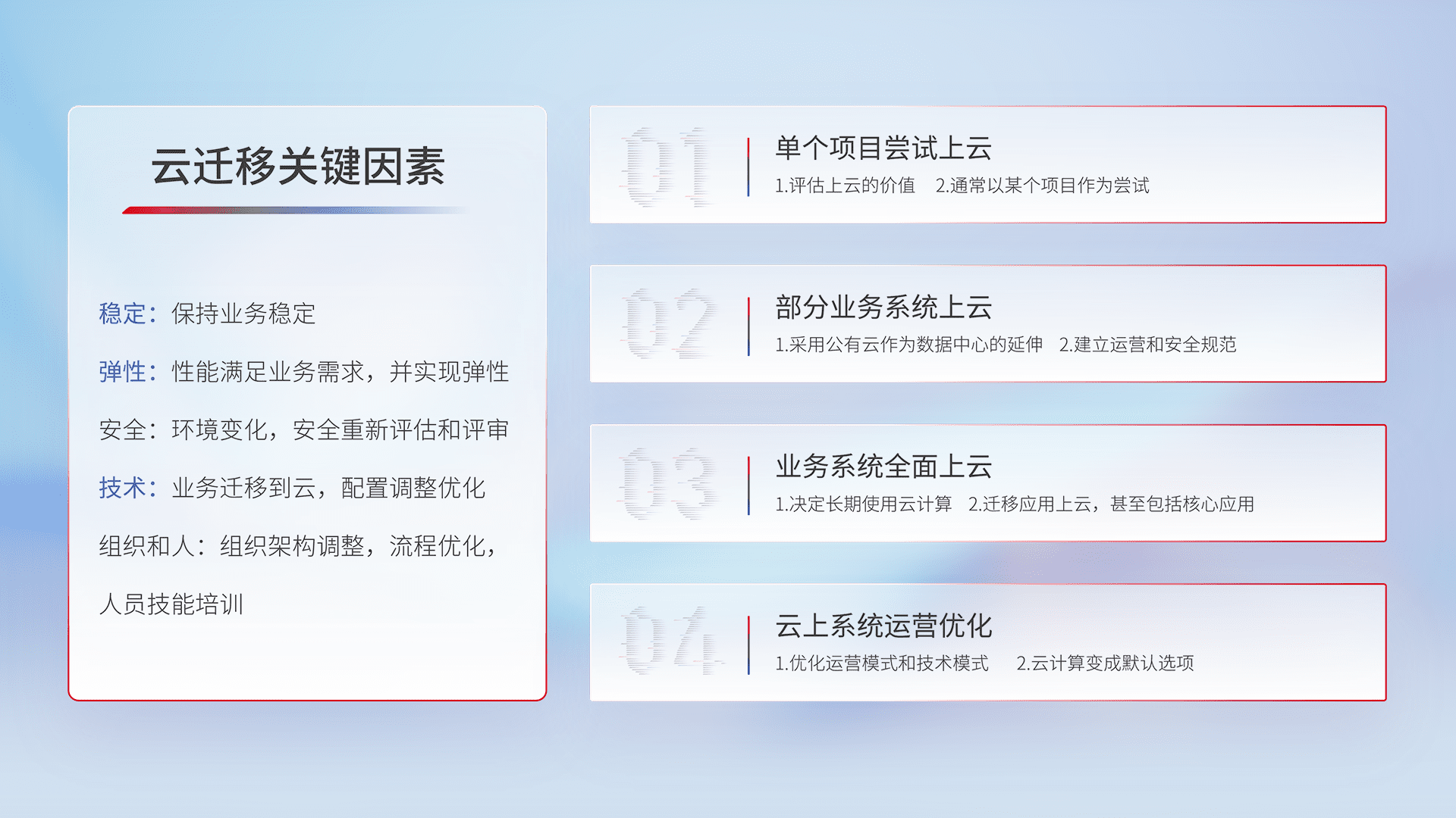 结合实际业务,,,从规划设计、、、、云平台选型、、、云原生改造、、、数据迁移、、、、集成交付,,,迁移全过程为客户识别最佳上云路径,,,,做好风险识别管理,,设计网络架构、、身份权限、、、、安全审计合规、、操作审计、、日志审计、、、、监控告警策略、、、、多站点容灾设计等,,对云上基础设施进行整体规划,,,,提升IT治理水平,,,以满足弹性、、、高可用、、、高性能的需求。。。。